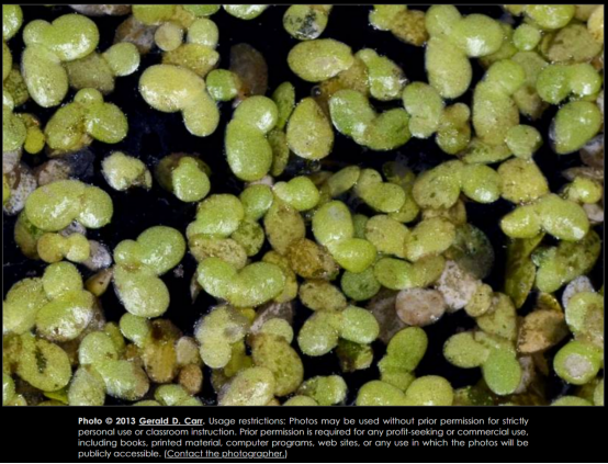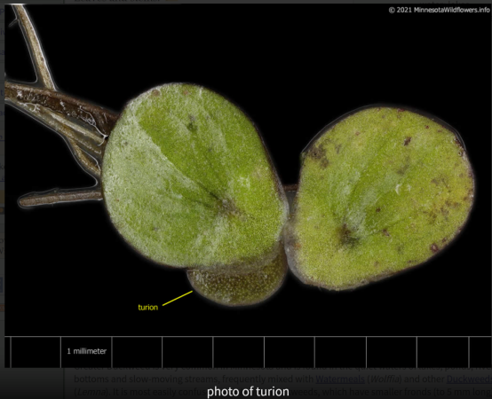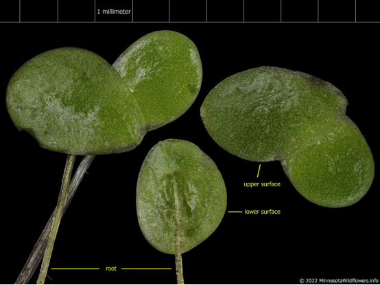 果實更稀奇——和花一樣少見,是顆1-1.5毫米、帶棱的小種子,沒毛。繁殖全靠“休眠芽”:圓滾滾/腎形的無根小芽,橄欖褐色。秋天芽兒落水底“冬眠”,春天回暖又浮上來,生根長葉,循環(huán)往復~(圖片來源 https://www.naturespot.org/species/greater-duckweed, Spirodela polyrrhiza (Greater Duckweed): Minnesota Wildflowers)
