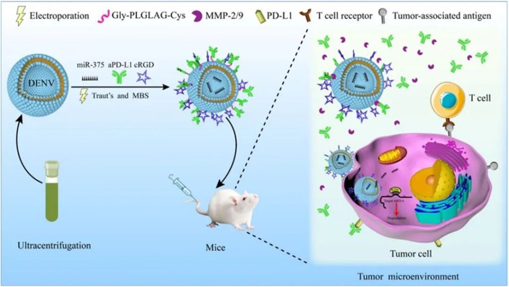 該系統(tǒng)以杜氏鹽藻(Dunaliella salina)提取的納米囊泡(DENV)為載體,通過(guò)表面修飾c(RGDyK)靶向肽,使其能夠特異性識(shí)別食管癌細(xì)胞表面整合素,增強(qiáng)腫瘤部位的富集能力并降低非特異性攝取。進(jìn)一步采用電穿孔技術(shù)將具有抑癌功能的miR-375高效載入囊泡內(nèi)部,同時(shí)在囊泡表面通過(guò)MMP-2敏感多肽連接抗PD-L1抗體(aPD-L1),構(gòu)建出兼具靶向、免疫調(diào)節(jié)與基因調(diào)控功能的工程化復(fù)合體系。該cRGD-DENV-aPDL1/miR375粒徑分布均勻(約150 nm),并在腫瘤微環(huán)境中高表達(dá)的MMP-2/9作用下可實(shí)現(xiàn)aPD-L1的響應(yīng)性釋放,具備良好的緩釋特性。