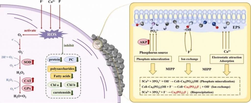 為揭示其深層作用機(jī)理,研究團(tuán)隊(duì)開展了系統(tǒng)的機(jī)理分析。結(jié)果表明,氟離子的高效固定源于特異性礦化反應(yīng):在礦化過程中,F(xiàn)?可精準(zhǔn)取代羥基磷灰石(Ca5 (PO4) 3OH,HAP)晶格中的羥基(OH?),形成穩(wěn)定性極強(qiáng)的氟磷灰石(Ca5 (PO4) 3F,F(xiàn)AP),從而實(shí)現(xiàn)氟離子的長效固定。同時,鈍頂螺旋藻分泌的胞外聚合物(extracellular polymeric substances,EPS)發(fā)揮了關(guān)鍵輔助作用,其中的多糖組分能夠?yàn)榱姿猁}沉淀提供充足的成核位點(diǎn),加速礦化結(jié)晶過程的啟動與推進(jìn)。