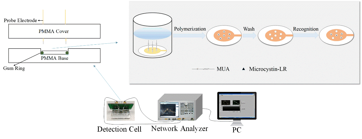 最近,蘇州醫(yī)工所微納技術(shù)研究室周連群團隊開發(fā)出一種結(jié)合了壓電技術(shù)和分子印跡技術(shù)的微囊藻毒素LR生物傳感器,并正在研發(fā)基于壓電技術(shù)的微囊藻毒素檢測系統(tǒng)。該團隊在20 MHz的石英微天平芯片上面通過分子自組裝及原位合成的技術(shù)修飾了針對微囊藻毒素LR特異性識別的多孔分子印跡膜。當(dāng)檢測樣品中存在微囊藻毒素LR時,微囊藻毒素LR分子將被特異性吸附到壓電芯片表面分子印跡膜內(nèi),壓電芯片表面產(chǎn)生質(zhì)量變化,通過檢測壓電芯片的頻率變化來檢測微囊藻毒素LR分子吸附量。該傳感器的檢測限為0.04 nM,擁有良好的特異性,可重復(fù)性使用,并可用于實際湖水樣本中微囊藻毒素LR的檢測。